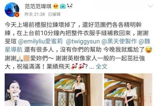 近日歌手范瑋琪現(xiàn)身某品牌的發(fā)布會現(xiàn)場,當天她身著一身黑白套裝十分干練。不過就在上場前10分鐘卻發(fā)生了尷尬一幕:套裝上衣的拉鏈臨時壞掉,幸好有幾位熱心粉絲幫忙趕工修復了衣服。一向寵粉的范范特意在社交平臺上發(fā)文感謝幫忙的粉絲,不過當天最精彩的部分并非舞臺上的表演而是范范在接受采訪時關于和小S等人的友情討論!