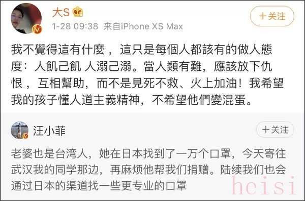 汪小菲1月27日發(fā)文表示,其妻子,臺(tái)灣藝人大S在日本購(gòu)買了1萬(wàn)個(gè)口罩,將寄往武漢同學(xué)處作為捐贈(zèng)物資。