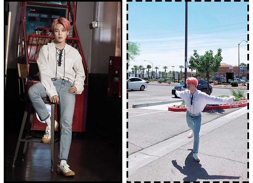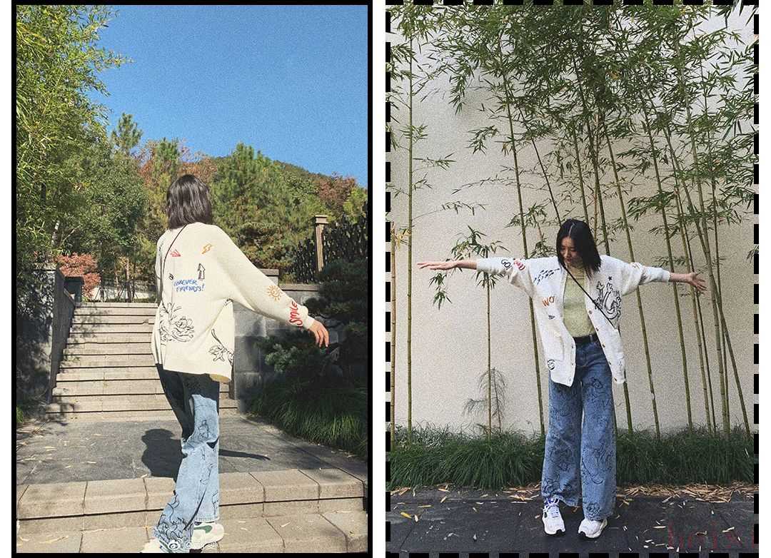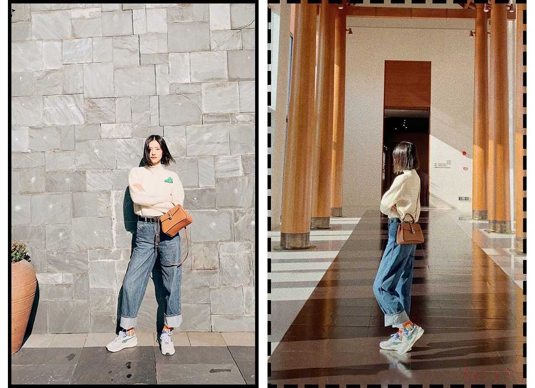 像PUMA X ADER ERROR聯(lián)名的灰藍(lán)配色,兩次都是搭配白色的毛衣+藍(lán)色牛仔褲,雖然第二件的印花有點(diǎn)花里胡哨,但穿在她身上感覺(jué)就是個(gè)青春洋溢的小女孩在嬉鬧、奔跑。