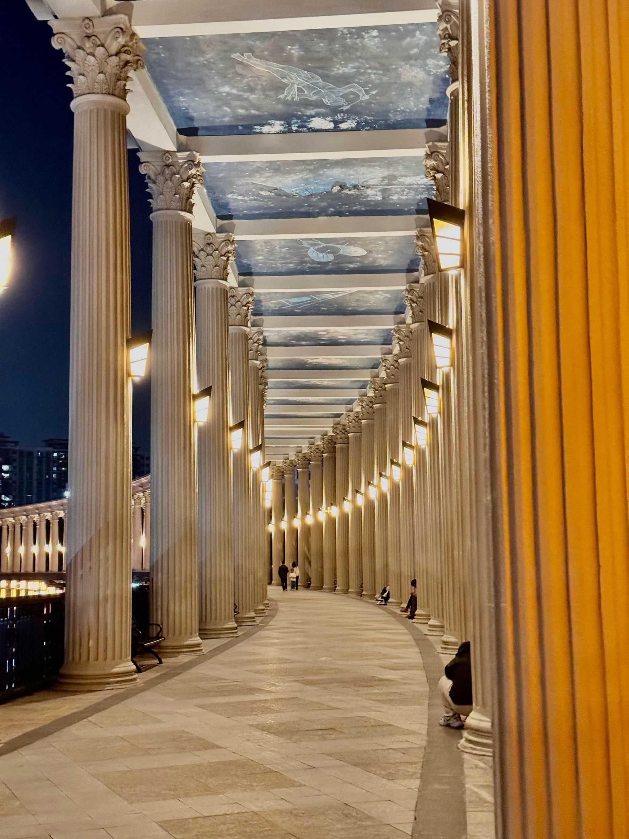 街區(qū)圍繞明華輪分布,廣場和商鋪采用典型的歐式設(shè)計,如拱形門窗、立柱裝飾和復(fù)古立面,讓人仿佛置身國外?。