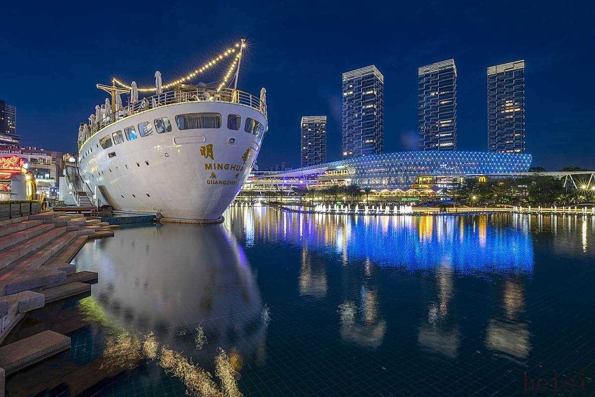 "特色:" 以藍(lán)色海洋為主題,建筑風(fēng)格融合了現(xiàn)代與古典,其中標(biāo)志性的“明華輪”餐廳是拍照的絕佳地點。周圍還有各種酒吧、餐廳,夜晚燈光璀璨,氛圍浪漫。