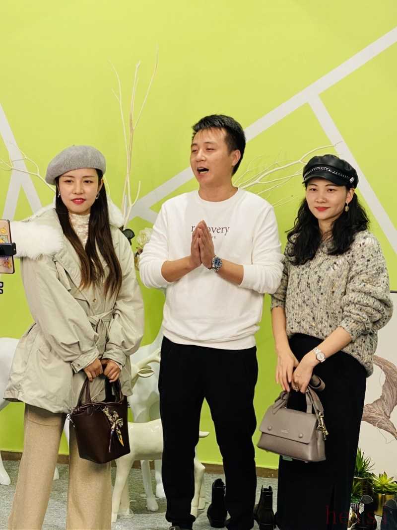 箱包品牌卡恒總裁黃維單(中)與南都優(yōu)選主播(左)和都瑞太和直播基地主播(右)一起帶貨。