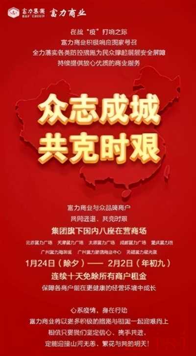 2020年,一個值得商業(yè)地產人銘記的年份。面向行業(yè)發(fā)展新形勢,富力商業(yè)乘勢而上,突破創(chuàng)新,攜手合作伙伴,打造了眾多溫暖記憶。此刻,歡迎搭乘「富力商業(yè)年度時光機」,共同重溫2020年富力商業(yè)與您共創(chuàng)的美好回憶,一同感受商業(yè)于城市和人文生活的力量。富力商業(yè)的社會擔當和榮譽同心抗疫 與商戶共度時艱為全力支持疫情防控工作,與商戶共克時艱,富力商業(yè)免除了集團旗下國內8座在營商場所有商戶1月24日(除夕)-2月2日(年初九)共10天租金,解商戶燃眉之急。