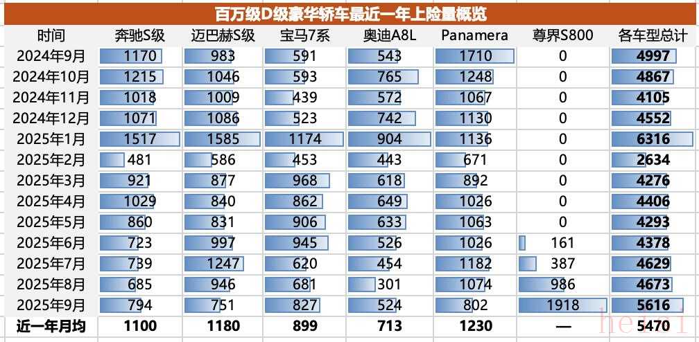 單看尊界S800一款車的數(shù)據(jù),確實(shí)沒什么感覺,我們把9月份其它幾款老牌D級超豪轎車一同拉出來對比,態(tài)勢就很明朗了: