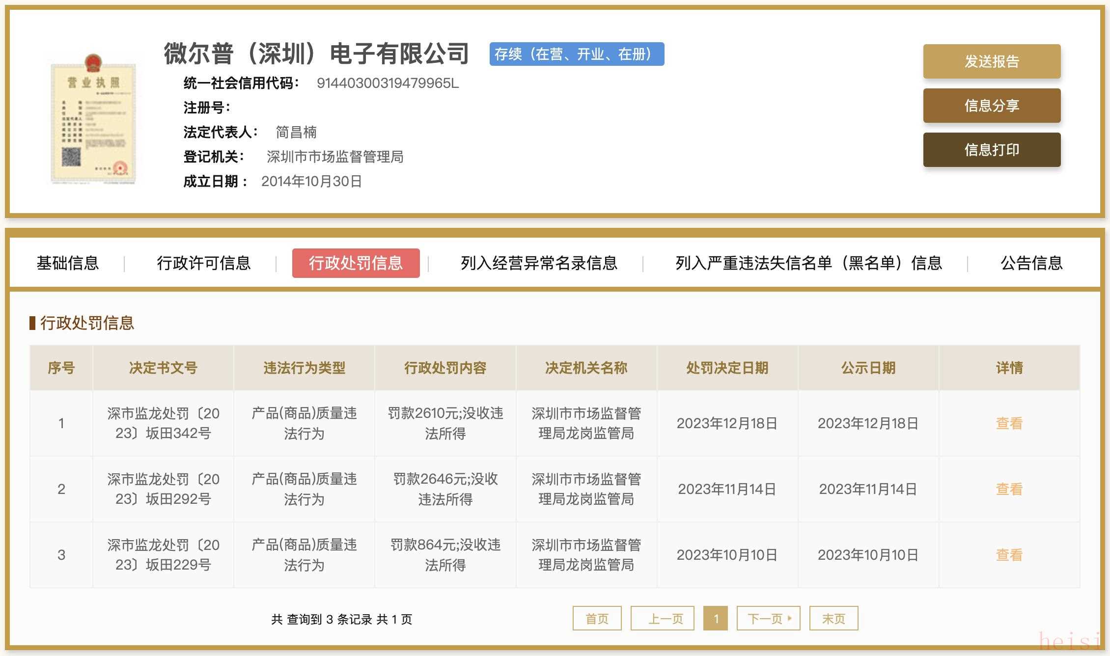 此外,關(guān)于產(chǎn)品質(zhì)量問(wèn)題也備受消費(fèi)者關(guān)注。在2023年10月到2023年12月期間,微爾普公司因產(chǎn)品(商品)質(zhì)量違法行為,接連三次被深圳市市場(chǎng)監(jiān)督管理局龍崗監(jiān)管局行政處罰。