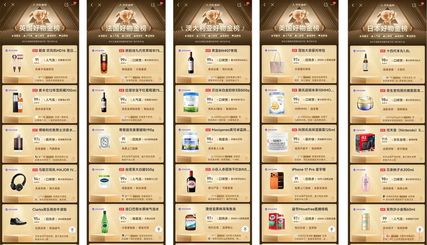 同時,京東全球購聯(lián)合京東金榜,上線覆蓋美國、日本、英國、法國、澳大利亞等15個國家/地區(qū)的“國家好物金榜”,榜單基于品牌影響力、用戶口碑、市場人氣、銷售增速等億級數(shù)據(jù)綜合甄選出日本白鶴(Hakutsuru)金標大吟釀 1.8L、英國戴森(Dyson)HD16吹風機、法國嬌韻詩(Clarins)九代雙萃精華75ML等涵蓋美妝個護、母嬰玩具、3C家電、時尚運動、食品酒水等全品類商品,精準匹配不同消費需求。針對金榜上榜商品,消費者還可領取滿200減20的“國寶驚喜券”,真正實現(xiàn)“足不出戶,購遍全球高品質(zhì)好物”。