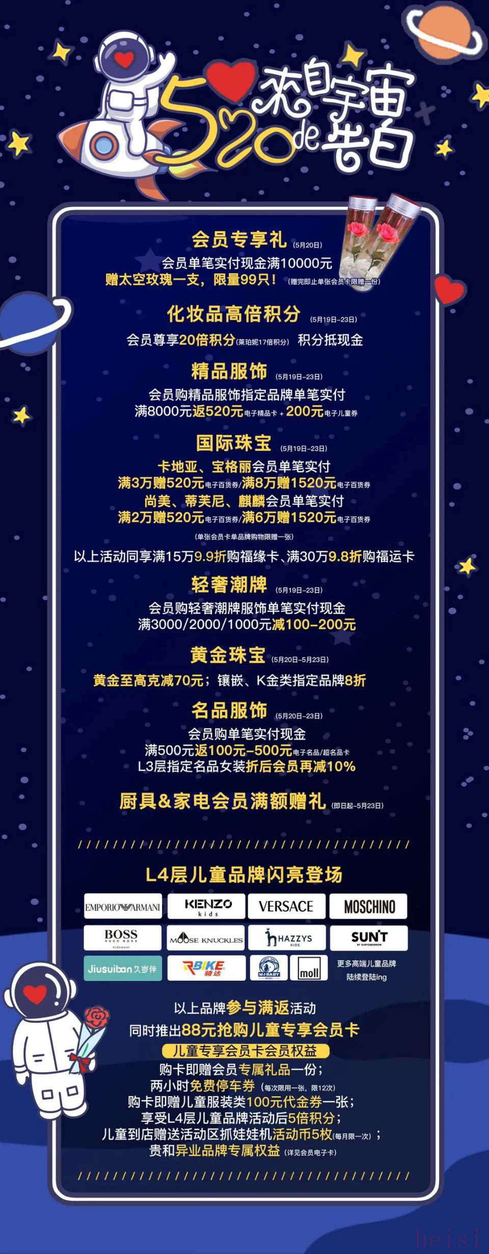 5.20告白季,一遇所愛,即刻傾慕。黃金直降80元、鑲嵌類珠寶8折起,饕餮美食65折起、雙人餐低至86元,爆款防曬5折起、消費滿299元立減60元,運(yùn)動服飾5折起、潮流女裝買3贈1……高新萬達(dá)廣場為大家?guī)砹诵囊鉂M滿的520。同時,更有送玫瑰、看豪車、探海洋等眾多驚喜活動等你來!