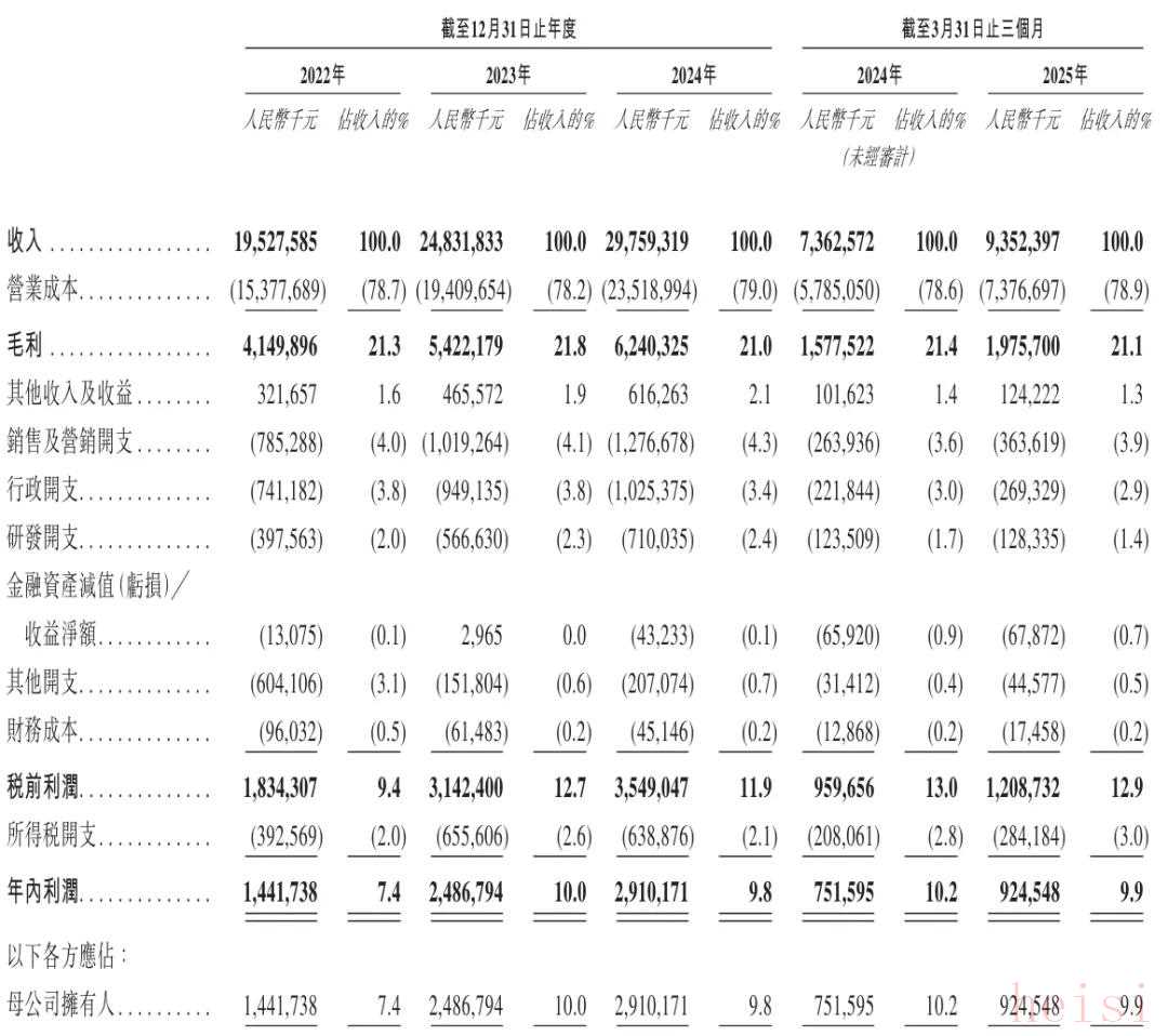 奧克斯以「奧克斯AUX」主品牌布局海內(nèi)外市場(chǎng),并通過(guò)多品牌戰(zhàn)略進(jìn)一步提高市場(chǎng)滲透率。奧克斯孵化品牌「華蒜」和「AUFIT」。奧克斯產(chǎn)品矩陣以家用空調(diào)和中央空調(diào)為主,圍繞節(jié)能、舒適、健康、智能四大方向深耕,奧克斯的家用空調(diào)包括掛機(jī)、柜機(jī)、移動(dòng)空調(diào)等品類(lèi);而奧克斯的中央空調(diào)包括多聯(lián)機(jī)、單元機(jī)、熱泵、模塊機(jī)及末端設(shè)備等品類(lèi)。奧克斯快速迭代產(chǎn)覆蓋家庭住宅、辦公樓宇、商場(chǎng)、酒店、醫(yī)院、工業(yè)產(chǎn)業(yè)園等眾多應(yīng)用場(chǎng)景。2023年至2024年,奧克斯與松下就壓縮機(jī)(即奧克斯產(chǎn)品的核心部件)的研究及生產(chǎn)建立戰(zhàn)略合作伙伴關(guān)系,奧克斯還在馬來(lái)西亞、泰國(guó)、美國(guó)、阿聯(lián)酋、越南及沙特阿拉伯設(shè)立海外銷(xiāo)售公司和組建本地團(tuán)隊(duì),加快自有品牌海外布局。招股書(shū)顯示,奧克斯2022年、2023年、2024年?duì)I收分別為195.28億元、248.32億元、297.59億元;毛利分別為41.5億元、54.22億元、62.4億元;毛利率分別為21.3%、21.8%、21%;期內(nèi)利潤(rùn)分別為14.42億元、24.87億元、29.1億元;期內(nèi)利潤(rùn)率分別為7.4%、10%、9.8%。奧克斯2022年、2023年、2024年經(jīng)調(diào)整凈利分別為14.49億元、25.11億元、29.35億元;EBITDA分別為23.64億元、35億元、39.38億元;