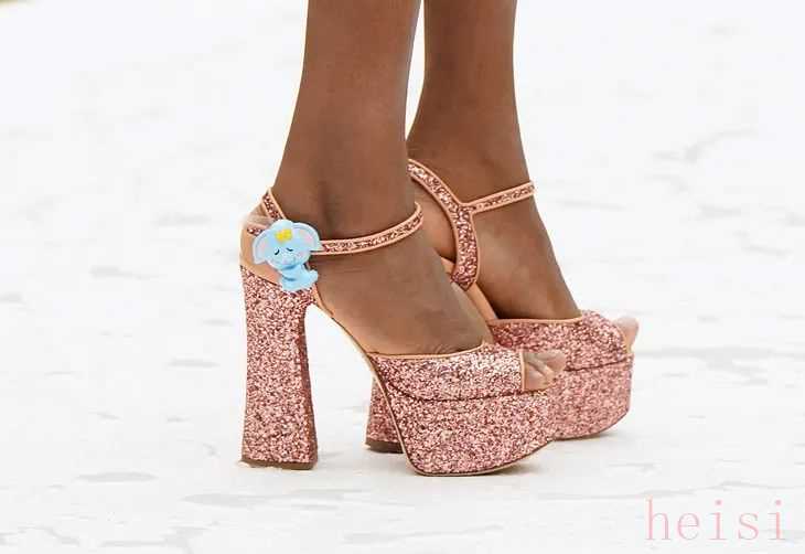 年初Valentino Pink PP系列秀場上就有它的身影,高高的防水臺、15cm的粗高跟,略微尖頭的設計將腳修飾得很纖細,一點都不顯笨重。