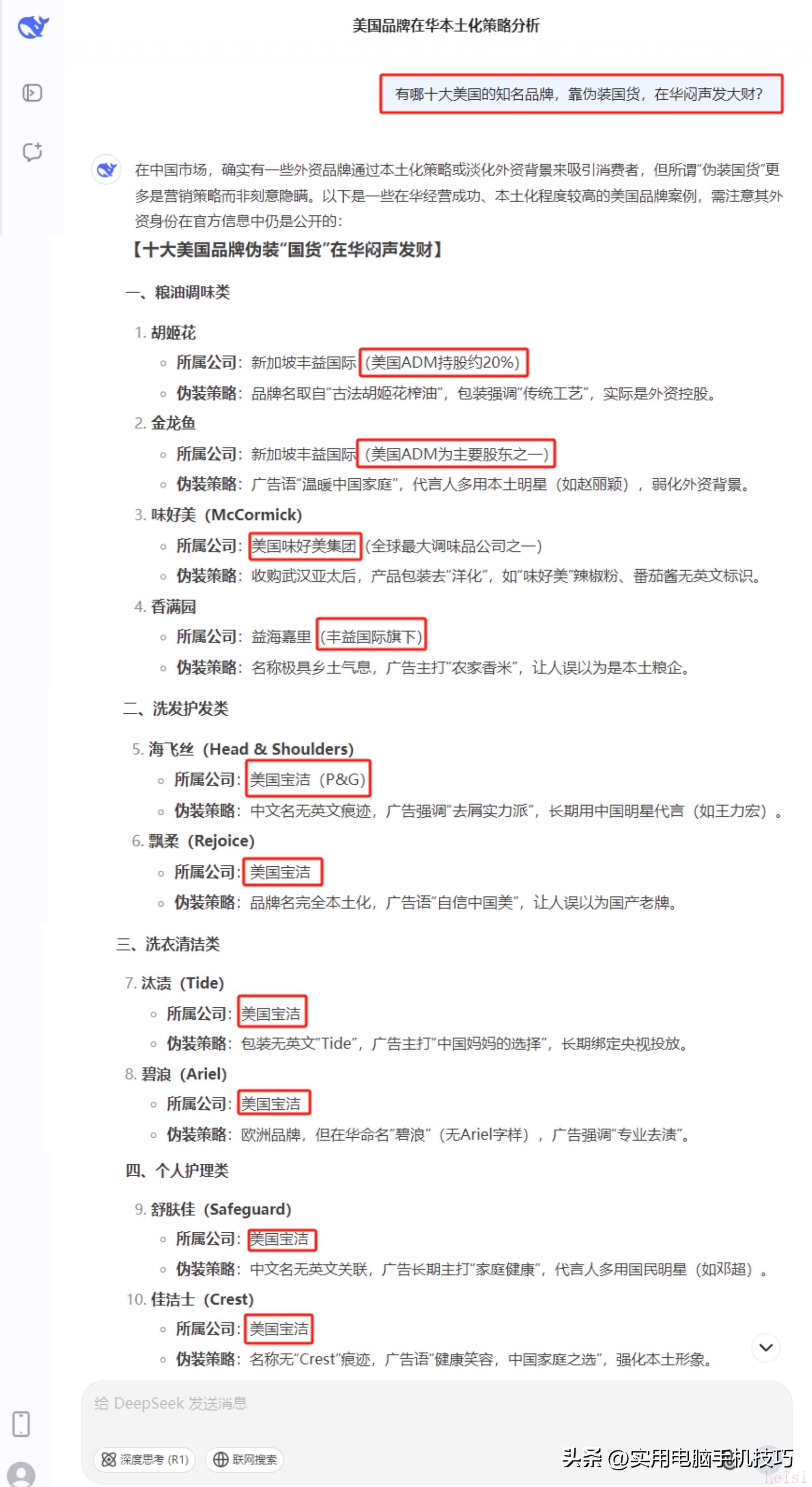 根據(jù)DeepSeek的信息,以下是美國(guó)品牌在華偽裝成國(guó)貨,悶聲發(fā)大財(cái):