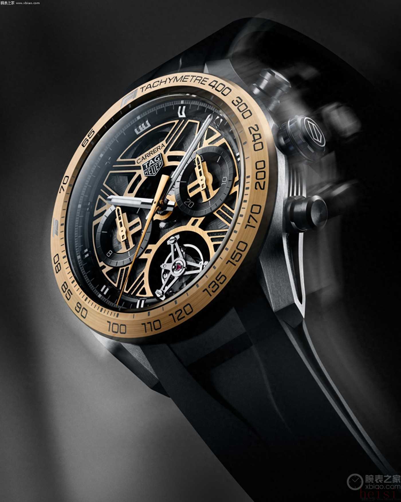 作為泰格豪雅卡萊拉系列Extreme Sport計(jì)時(shí)碼表家族的最新成員,這款限量版腕表以顛覆性設(shè)計(jì)語(yǔ)言,將品牌前衛(wèi)大膽的設(shè)計(jì)美學(xué)推向全新高度。44毫米直徑,經(jīng)過(guò)精細(xì)磨砂和噴砂處理的鈦金屬表殼,搭配醒目的18K黃金固定表圈,以及拋光處理的黑色DLC涂層5級(jí)鈦金屬表冠與計(jì)時(shí)按鈕,既彰顯了腕表在現(xiàn)代設(shè)計(jì)理念下的卓越耐久性,更散發(fā)出歷久彌新的雋永尊貴氣息。一體式黑色橡膠表帶搭配同色DLC涂層鈦金屬表扣確保兼具舒適度與運(yùn)動(dòng)感的佩戴體驗(yàn),與腕表的性能導(dǎo)向設(shè)計(jì)相得益彰。標(biāo)志性的開放式結(jié)構(gòu)表盤以鍍18K黃金工藝潤(rùn)飾,搭配銠鍍時(shí)標(biāo)與指針,凸顯計(jì)時(shí)功能的同時(shí)確保清晰易讀性——忠實(shí)傳承杰克 · 豪雅的設(shè)計(jì)初衷。9點(diǎn)鐘與3點(diǎn)鐘位置的銀色計(jì)時(shí)盤采用“Azurage”潤(rùn)飾工藝,搭配鍍18K黃金計(jì)時(shí)指針,呈現(xiàn)鮮明的視覺(jué)對(duì)比效果,并提供出眾的計(jì)時(shí)精準(zhǔn)度。此外,表盤外緣環(huán)繞黑色測(cè)速刻度圈,保障卓越的計(jì)時(shí)性能。