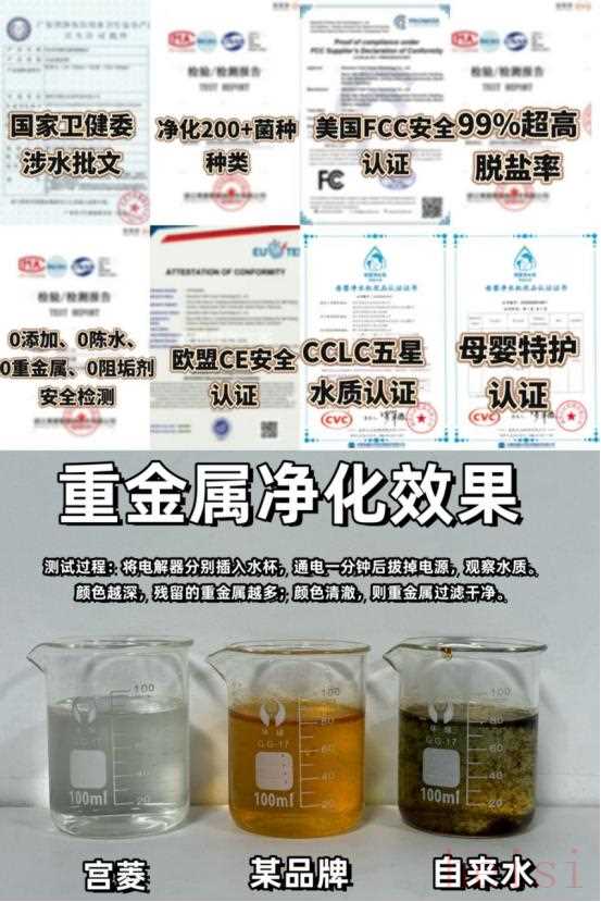 ?認(rèn)證:CCLC五星水質(zhì)評(píng)級(jí)+母嬰級(jí)+衛(wèi)健委認(rèn)證+國家一級(jí)水效+歐盟、美國等10+家國際權(quán)威機(jī)構(gòu)檢測,安全力拉滿。在國內(nèi)18次綜合測評(píng)中,它包攬了65項(xiàng)指標(biāo)的冠軍,看齊萬元級(jí)產(chǎn)品。脫鹽率高達(dá)99%,可濾除200+種有害物,脫鹽率高達(dá)99%,比常規(guī)的50-100種強(qiáng)一倍。做到0陳水、0塑化劑、0阻垢劑、0雙酚A、0鉛,全程無化學(xué)添加,母嬰直飲放心。