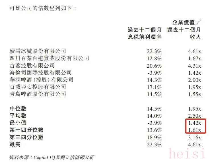 具體而言,估值師選出了7家可比的上市公司,包括:蜜雪冰城、茶百道、古茗、海倫司、華潤啤酒、百威亞太、青島啤酒。這些公司都滿足兩個標準:主要運營地在中國,并且是收入50%以上來自中國的香港上市公司;主營業(yè)務(wù)為提供現(xiàn)制飲品或生產(chǎn)、銷售及分銷啤酒產(chǎn)品的企業(yè)。