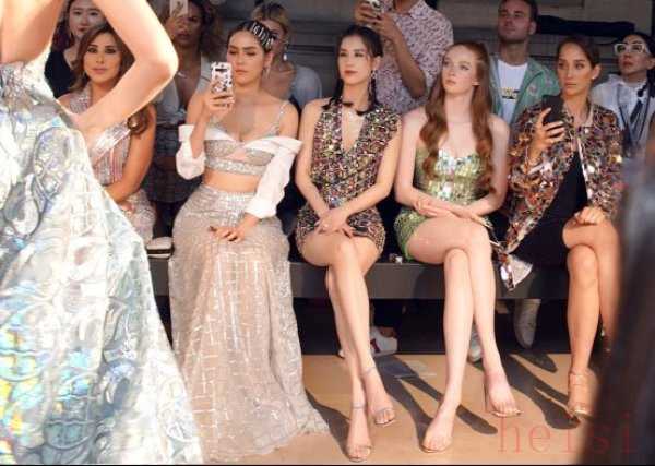 在Rami Kadi Couture秀場上,黃圣依受邀頭排看秀,在人群中格外璀璨亮眼。短款的包裙設(shè)計(jì),展露黃圣依修長白皙的大美腿。