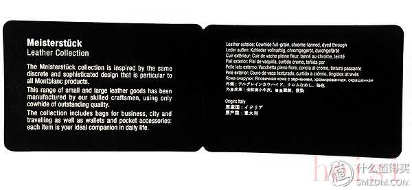 包裝盒中還有兩張卡片,說(shuō)明了錢包的產(chǎn)地和材質(zhì),可以看到皮質(zhì)是在意大利縫制完成的,鉻鹽鞣皮的小牛皮,內(nèi)部的布料是德國(guó)縫制的;我喜歡萬(wàn)寶龍的另一點(diǎn)就是他的嚴(yán)謹(jǐn),從他現(xiàn)在還五大鋼筆中唯一用心做鋼筆的就可以看出,這種詳細(xì)標(biāo)明材質(zhì)、產(chǎn)地、工藝的行為,很是難得;