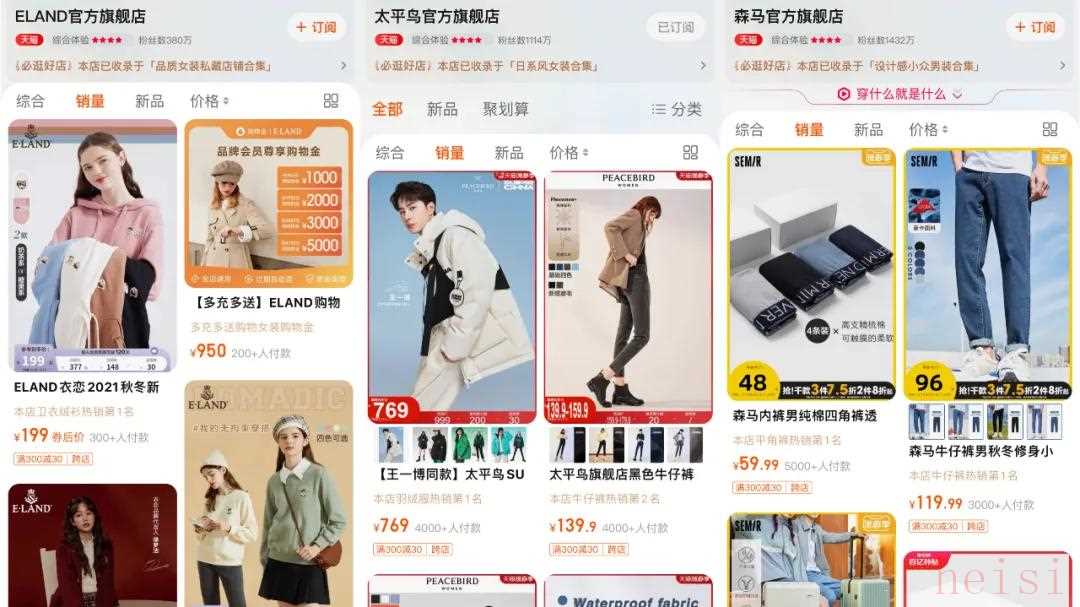 另一方面,與同行相比,ELAND國內(nèi)線上渠道的發(fā)展也略顯遜色。截至2022年2月16日,在天貓平臺上,ELAND、太平鳥、森馬的旗艦店粉絲數(shù)分別為380萬、1114萬、1432萬,其中ELAND銷量第一的產(chǎn)品有超過300人付款,而太平鳥、森馬銷量第一的產(chǎn)品付款人數(shù)均超過4000人。