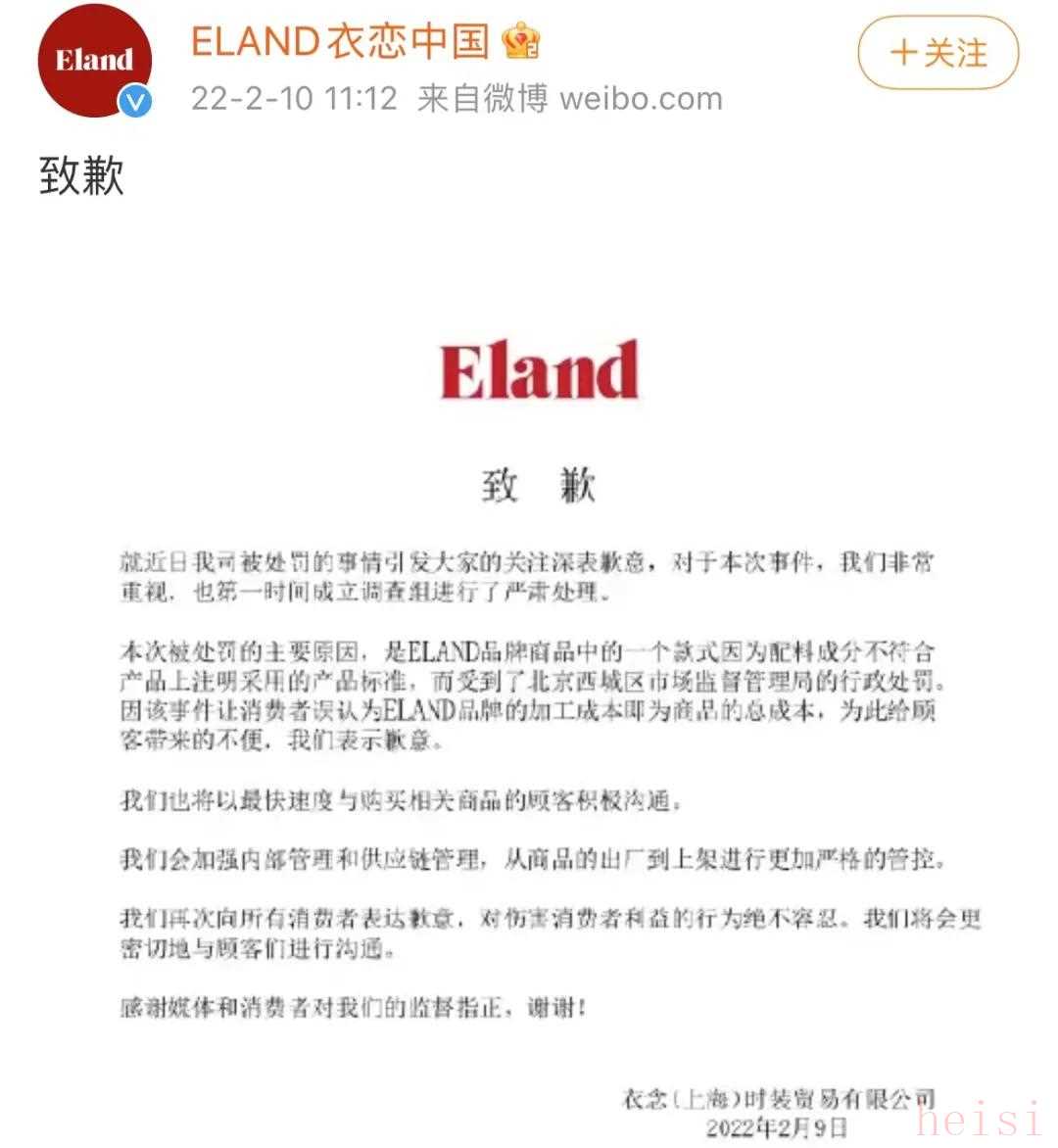 隨著輿論愈演愈烈,衣戀中國于2022年2月10日發(fā)表致歉聲明,聲明顯示,“因該事件讓消費者誤以為ELAND品牌的加工成本即為商品的總成本,為此給顧客帶來的不便,我們表示歉意。”