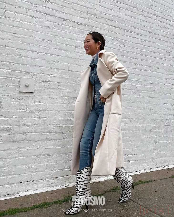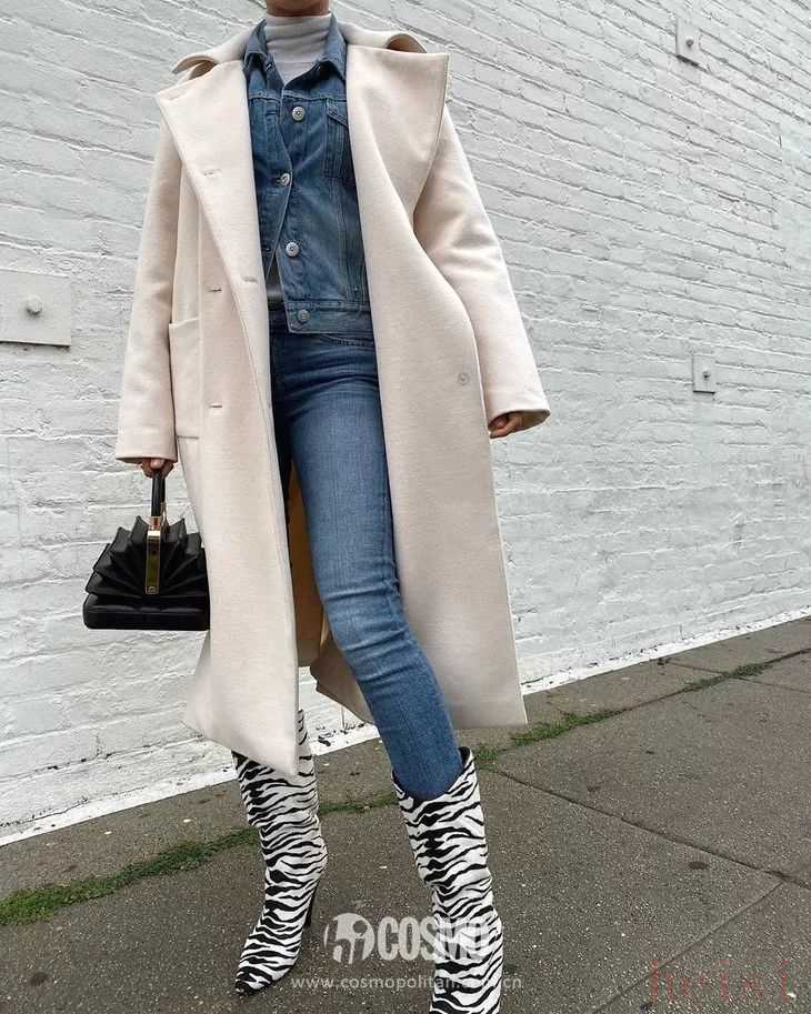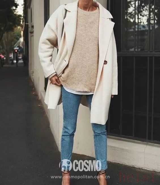 比起黑灰色大衣,乳白色大衣和牛仔單品的組合明顯更加清爽。