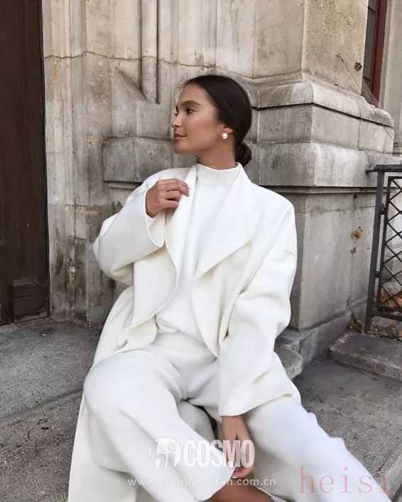 羊絨質(zhì)地的白色大衣看上去質(zhì)感一流,還能讓你整個冬天溫暖不打烊。除了毛呢混紡質(zhì)地的大衣以外,羊絨材質(zhì)的會更加凸顯整體造型的高級感。