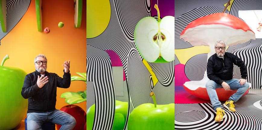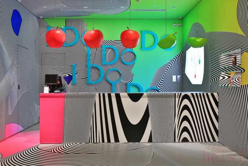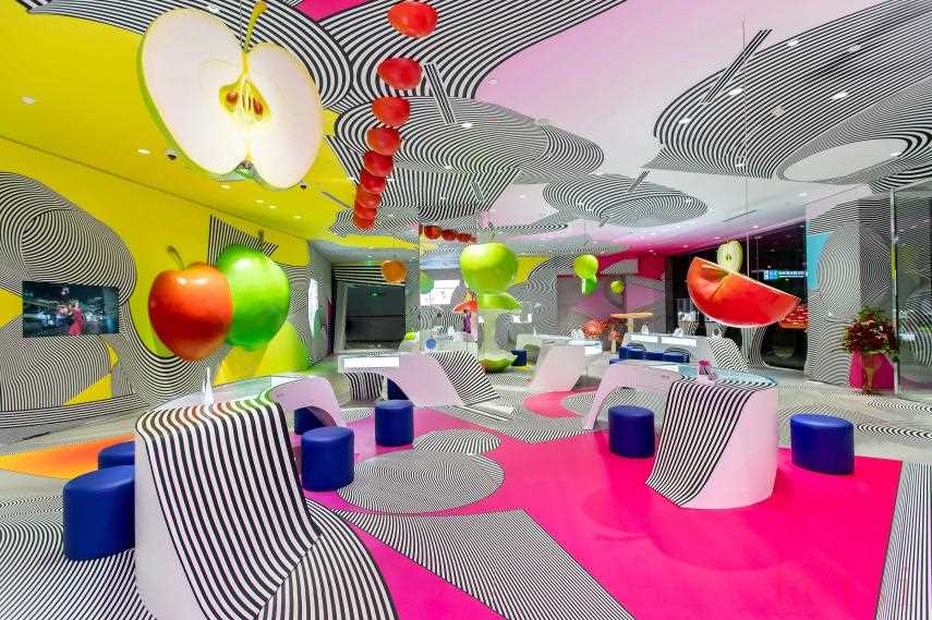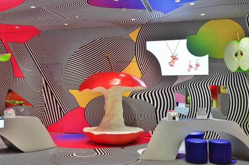 除蘋果外,店內(nèi)所有元素也都有著不同的具象表意。黑白條紋是Tobias藝術(shù)作品的明顯標(biāo)識之一,它們的疊加帶來水波紋的暈眩動感,仿佛愛的迷幻世界。黑白條紋之上,大面積的炫彩色塊為空間增添了欣喜的躍動感,象征著日出時分的動人景象,引人步入愛的浪漫之境。不多見的五葉草也是幸運(yùn)的象征。傳說中,只有幸運(yùn)的人才能找到五葉草,觸摸第一片葉子就會收獲真愛。此外,Tobias更創(chuàng)意地將知更鳥蛋藍(lán)色涂抹于Logo墻。他解釋道:“知更鳥蛋象征著愛的永恒。因為知更鳥一生只會選擇一位伴侶,選定后便相伴終生,不離不棄。這份守護(hù)真愛的決心就像I Do所傳遞的一樣,守護(hù)每一句我愿意。”