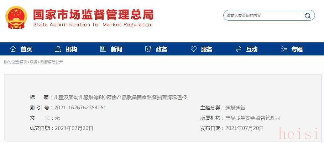 中國(guó)質(zhì)量新聞網(wǎng)訊 7月20日,市場(chǎng)監(jiān)管總局網(wǎng)站通報(bào)兒童及嬰幼兒服裝等8種網(wǎng)售產(chǎn)品質(zhì)量國(guó)家監(jiān)督抽查情況。為加強(qiáng)網(wǎng)售產(chǎn)品質(zhì)量安全監(jiān)管,營(yíng)造安全放心的網(wǎng)絡(luò)消費(fèi)環(huán)境,市場(chǎng)監(jiān)管總局近期組織開展了兒童及嬰幼兒服裝等8種網(wǎng)售產(chǎn)品質(zhì)量國(guó)家監(jiān)督抽查?,F(xiàn)將有關(guān)情況通報(bào)如下: