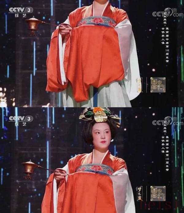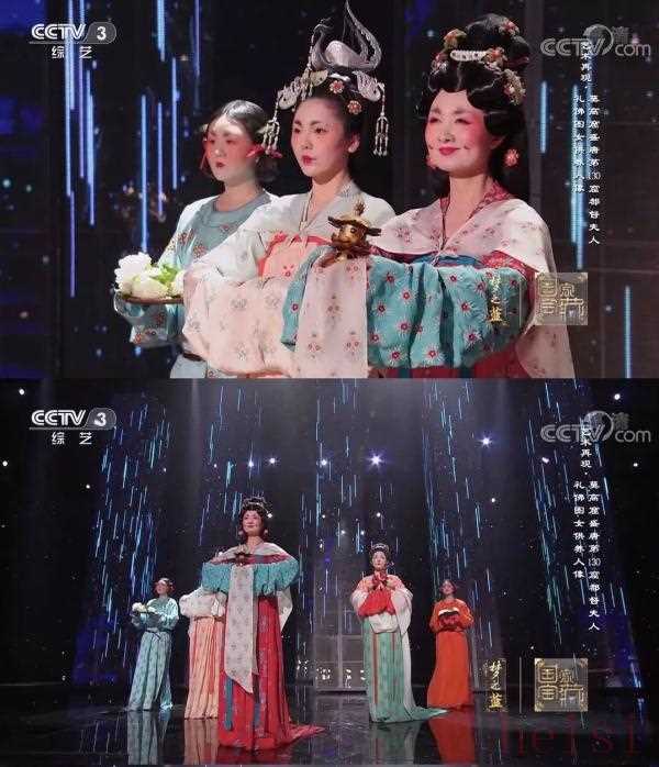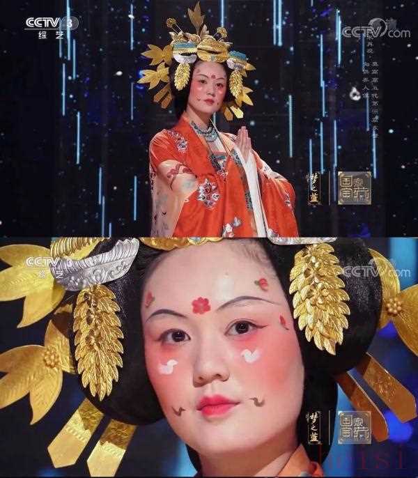 在1月13日的《國家寶藏》中,佟麗婭復原了絹衣彩繪木俑的穿著妝容,一展盛唐風采。被觀眾譽為:形容昳麗,盛唐絕貌。