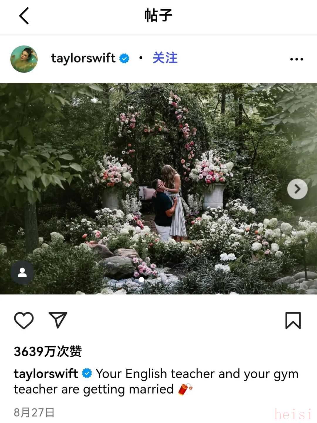 霉霉曬出了二人的花園求婚照,并俏皮配文“你的英語(yǔ)老師和你的體育老師要結(jié)婚了”。