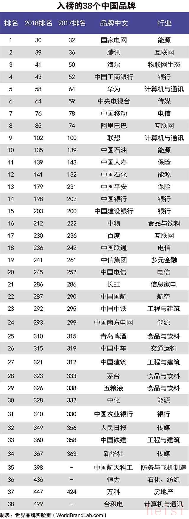 在對(duì)全球2萬(wàn)個(gè)知名品牌市場(chǎng)占有率、品牌忠誠(chéng)度和全球領(lǐng)導(dǎo)力進(jìn)行評(píng)分后,12月18日,世界品牌實(shí)驗(yàn)室(World Brand Lab)在美國(guó)紐約發(fā)布了2018年“世界品牌500強(qiáng)”排行榜。中國(guó)有38個(gè)品牌入選,在總量上排名第五。