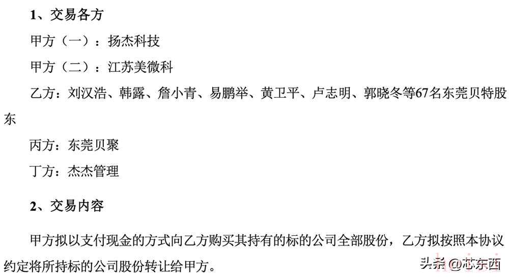 根據(jù)交易各方簽署的《股份轉(zhuǎn)讓協(xié)議》, 本次交易中提供業(yè)績承諾的貝特電子股東將共同出資成立持股平臺東莞貝聚,由東莞貝聚通過大宗交易的方式從上市公司揚杰電子控制的建水縣杰杰管理受讓不低于7.16億元交易金額的揚杰科技股票并將取得的揚杰科技股票全部質(zhì)押給揚杰科技全資子公司江蘇美微科,并自愿鎖定至2028年6月30日以作為業(yè)績承諾的履約保障。