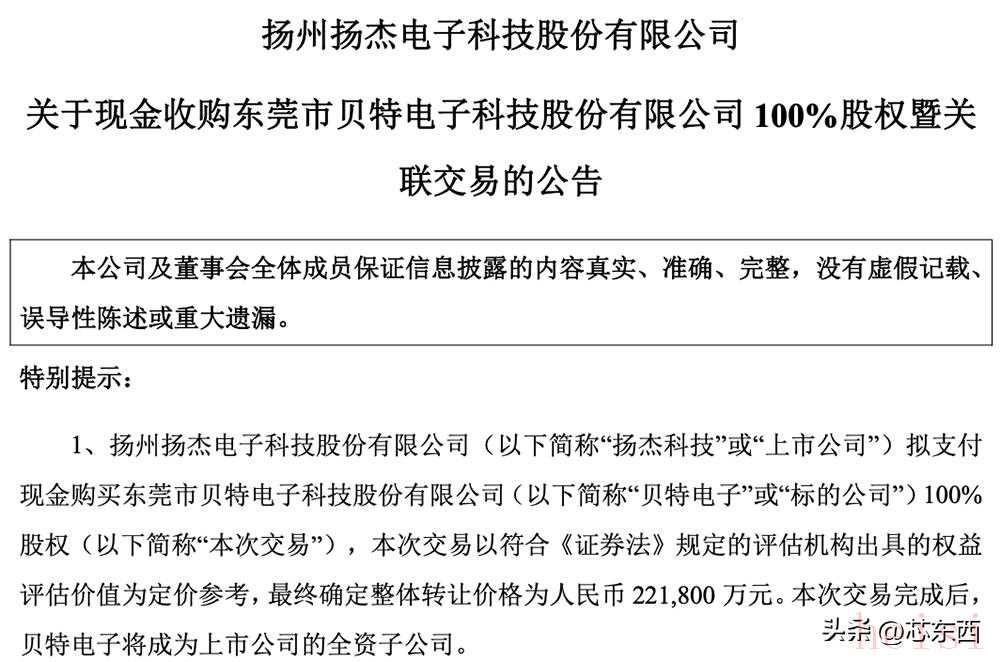 作者 | ZeR0編輯 | 漠影芯東西9月12日報道,9月11日,江蘇揚州半導體分立器件芯片上市公司揚杰電子發(fā)布公告,宣布擬支付現(xiàn)金購買廣東東莞電力電子保護元器件公司貝特電子100%股權(quán),整體轉(zhuǎn)讓價格為22.18億元。
