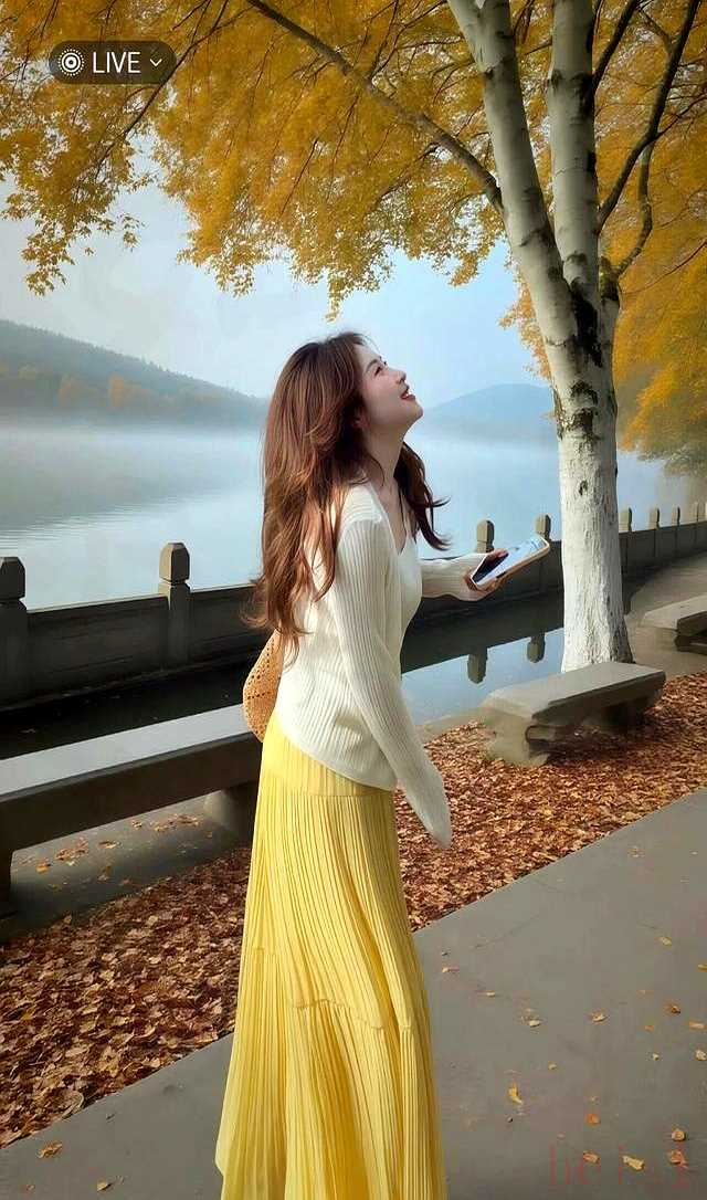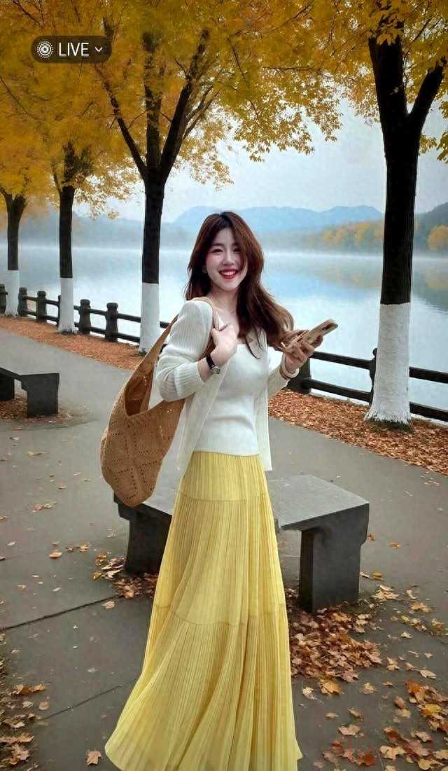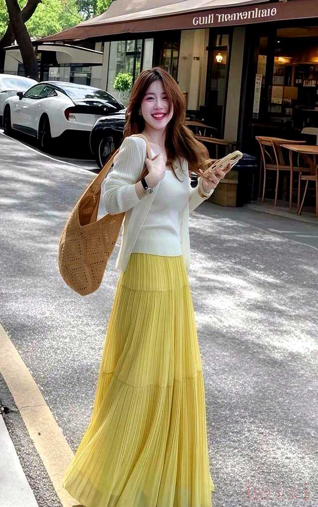 白色薄開衫+鵝黃色長(zhǎng)裙,看起來(lái)平平,勝在把亞洲人膚色最頭疼的“黃”變成了反光板。