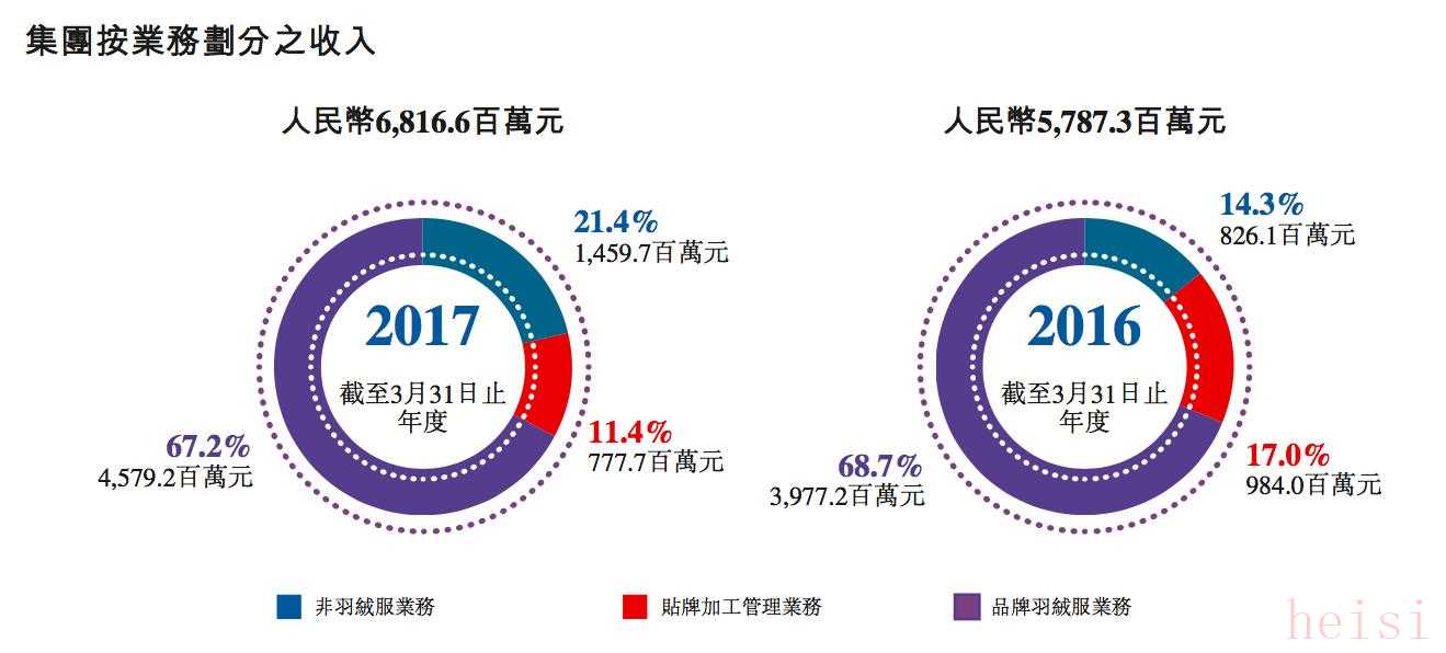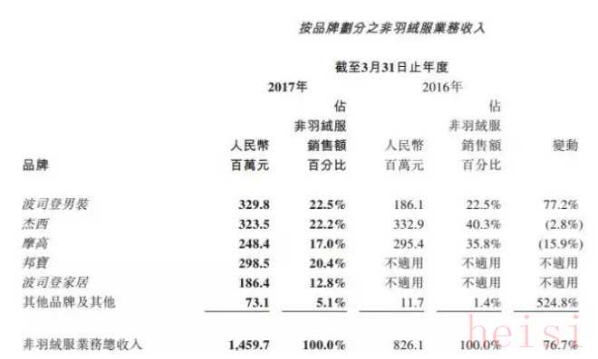 從公司財報看,波司登2016財年(截至2017年3月31日的12個月內(nèi))銷售額上漲17.8%,達(dá)到68.17億元人民幣。其中,羽絨服業(yè)務(wù)銷售額為45.79億元,同比增長15.1%,占整體銷售額的67.2%;非羽絨服業(yè)務(wù)銷售額為14.59億元,同比漲幅達(dá)76.7%,占集團(tuán)總銷售額的21.4%。男裝、女裝、居家生活服裝等組成了公司的非羽絨服板塊。波司登男裝是非羽絨服品牌中銷量最好的品牌,報告期內(nèi)銷售額為3.30億元,占非羽絨服品牌22.5%的銷售份額;其余依次為女裝品牌杰西、邦寶、男裝品牌摩高(已于今年2月售出)、家居品牌波司登家居等,銷售額分別為3.26億元、2.99億元、2.48億元及1.86億元。