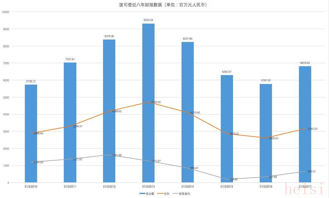 不過,波司登近年來的財報數(shù)據(jù)并不盡如人意。波司登2012年年報數(shù)據(jù)顯示,報告期內(nèi)公司實(shí)現(xiàn)93.25億元銷售額,創(chuàng)下近八年來最高。自此之后,波司登銷售額一路下跌至57.87億元,直到2016年財年有所回升至68.17億元。波司登的羽絨服業(yè)務(wù)也由2014年的60.57億元銷售額下滑至2017財年的45.79億元。