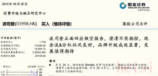 6月25日早間,波司登發(fā)布澄清公告,否認(rèn)Bonitas報(bào)告中的所有指控,“希望Bonitas及其研究主管訪問本公司,以更好地了解我們公司的戰(zhàn)略、業(yè)務(wù)布局及營(yíng)運(yùn)?!蓖瑫r(shí)波司登股票恢復(fù)買賣,25日收盤時(shí),波司登漲15.03%,報(bào)收1.99港元。