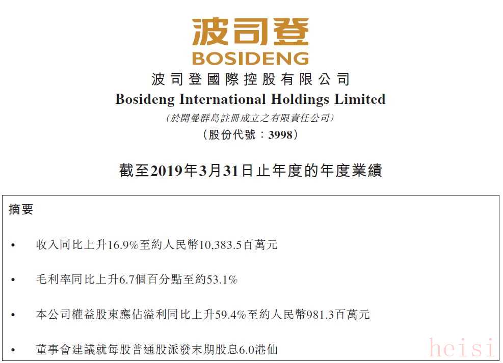 而在今天午間,波司登發(fā)布截至2019年3月31日的上一財(cái)年財(cái)報(bào),2019財(cái)年公司全年?duì)I收為103.83億元(人民幣,下同),去年同期為88.81億元,收入同比上升16.9%;公司權(quán)益股東應(yīng)占溢利同比上升59.4%至約9.81億元。
