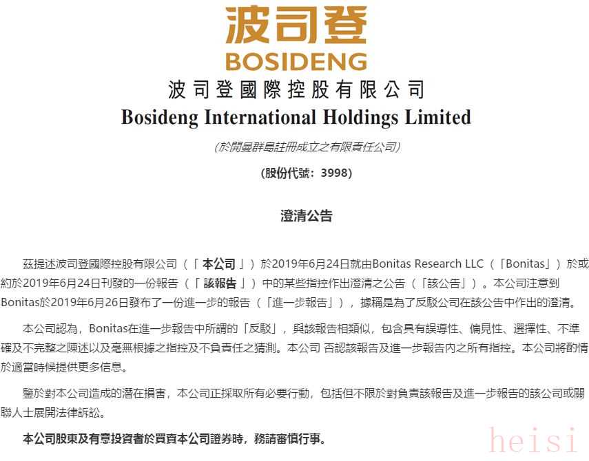 此前在6月25日早間,波司登在港交所發(fā)布公告澄清,否認(rèn)Bonitas報(bào)告中對(duì)本公司之所有指控: