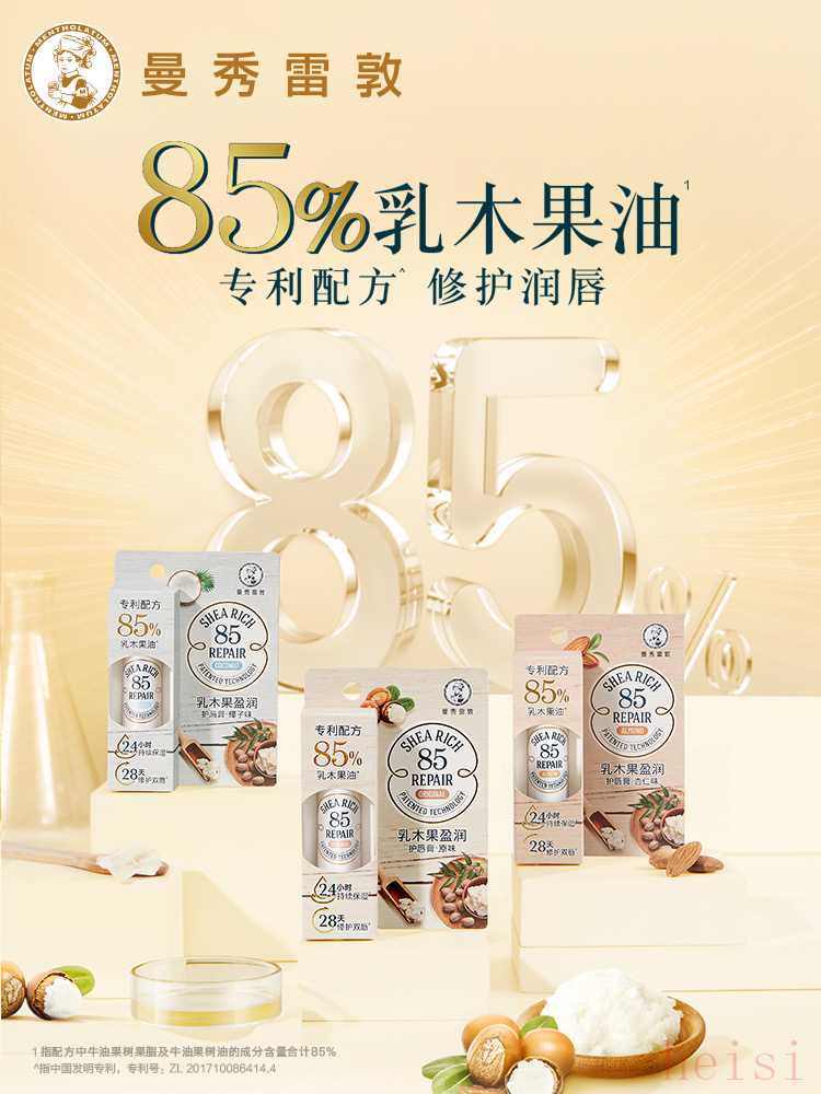 不止于此,即便潤唇膏品類已經(jīng)是曼秀雷敦表現(xiàn)十分出色的核心品類,曼秀雷敦仍在不知疲倦地“耕耘”著。今年重磅推出的85修護(hù)潤唇膏(產(chǎn)品全名為曼秀雷敦乳木果盈潤護(hù)唇膏)則從根本上證明了曼秀雷敦在行業(yè)里的先驅(qū)地位。乳木果油原產(chǎn)于非洲西部和中部,是從乳木果樹的堅(jiān)果中萃取所得。由于本身有著出色的保濕滋潤能力和修復(fù)能力,乳木果油在護(hù)膚品中的運(yùn)用十分廣泛,但因?yàn)楸旧砣埸c(diǎn)不高、質(zhì)地柔軟如黃油,其很容易在接觸皮膚后迅速融化,隨著在護(hù)膚品中添加量的增加,產(chǎn)品的凝固穩(wěn)定性也會(huì)隨之減弱,而曼秀雷敦通過創(chuàng)新,令膏體乳木果油含量達(dá)到85%超高濃度的同時(shí),還能保證膏體凝固,帶來穩(wěn)定而滋潤的用戶體驗(yàn)?!拔覀兺ㄟ^科技創(chuàng)新,在保證膏體含有85%超高濃度乳木果油的情況下,還能保持潤唇膏的凝固穩(wěn)定,給消費(fèi)者帶來持續(xù)穩(wěn)定的使用體驗(yàn),幫助唇部肌膚持續(xù)保濕?!敝档靡惶岬氖?,來自曼秀雷敦的這一創(chuàng)新技術(shù)目前已取得國家專利技術(shù)認(rèn)證。(*專利發(fā)明名稱:一種高含量乳木果油的護(hù)唇產(chǎn)品及其制備方法,專利號:ZL 2017 1 0086414.4)。