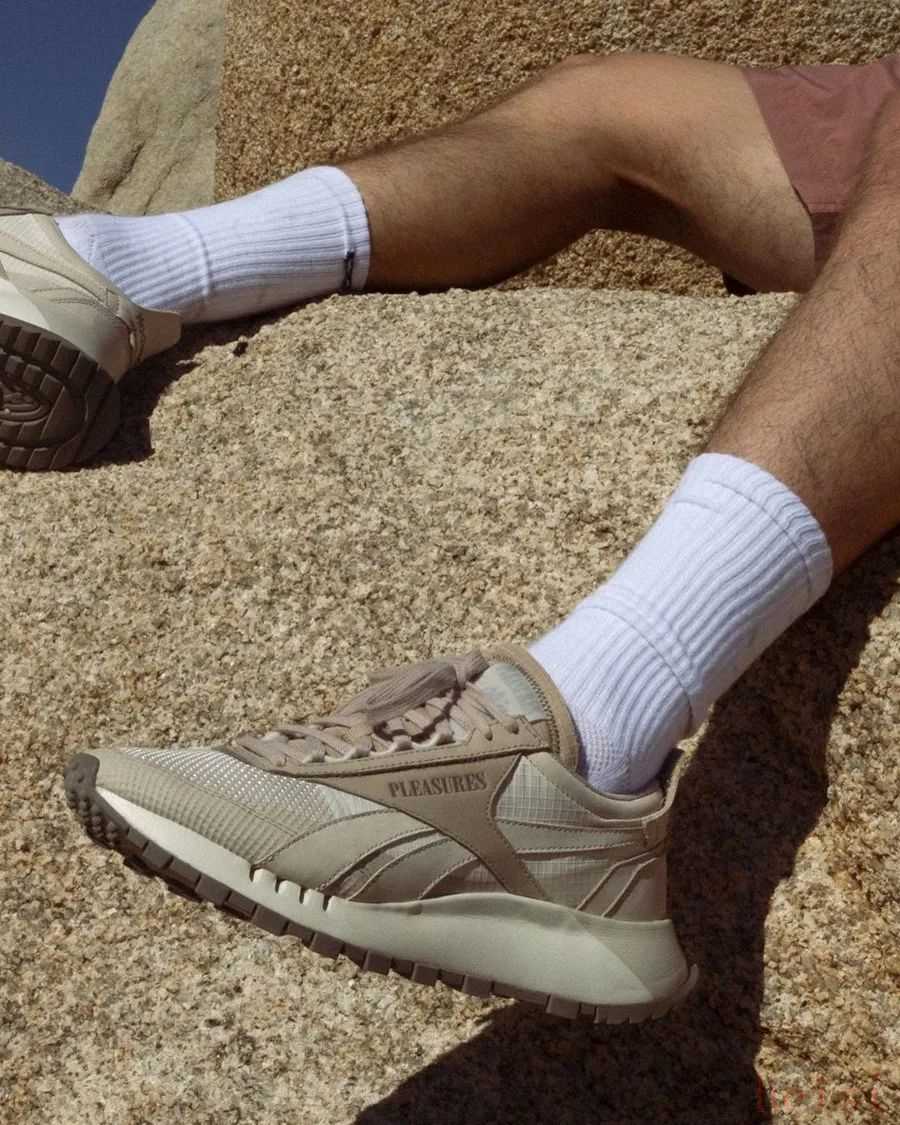Pleasures 聯(lián)合創(chuàng)始人 Alex James 熱愛加州沙漠,本次結(jié)合 Classic Leather 鞋型,便使用了淺泥土色和淺奶油色呈現(xiàn)出優(yōu)秀的復(fù)古外觀。