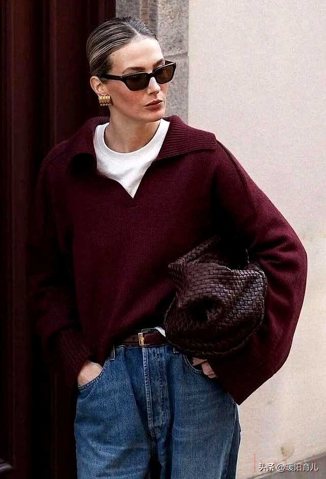 翻領(lǐng)毛衣最好選擇稍微寬松的版型,太緊身反而顯得老氣。