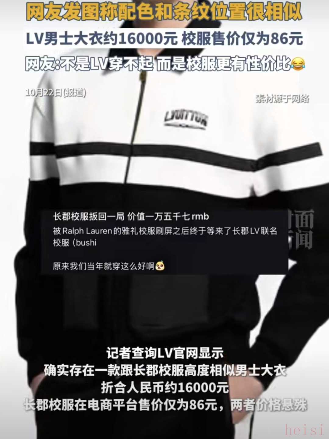 事件起源于10月23日,有網(wǎng)友在微博、抖音等社交平臺發(fā)帖,貼出對比圖顯示,LV的這款秋冬男士大衣與長沙某中學(xué)的校服在黑白配色比例和束袖口設(shè)計上驚人相似。從圖片可見,兩者均以黑白為主色調(diào),袖口采用束緊風(fēng)格,整體輪廓相近。然而,價格懸殊極大——LV大衣官方售價16000元,而中學(xué)校服僅需86元,差價近200倍。這一發(fā)現(xiàn)迅速引發(fā)熱議,不少網(wǎng)友幽默評論“原來時尚盡頭是校服”,也有人感嘆“校服性價比碾壓奢侈品”,話題在短時間內(nèi)登上熱搜榜,折射出公眾對奢侈品牌與日常用品對比的濃厚興趣。
