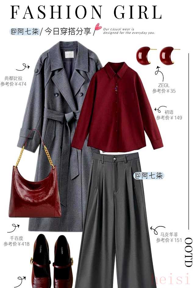 這身搭配聽起來非常棒!秋季的灰色風(fēng)衣搭配酒紅色襯衫,既能打造出高級感,又兼顧了通勤的實(shí)用性和疊穿的層次感。下面是一些更具體的建議和思路,幫助你完善這身穿搭: