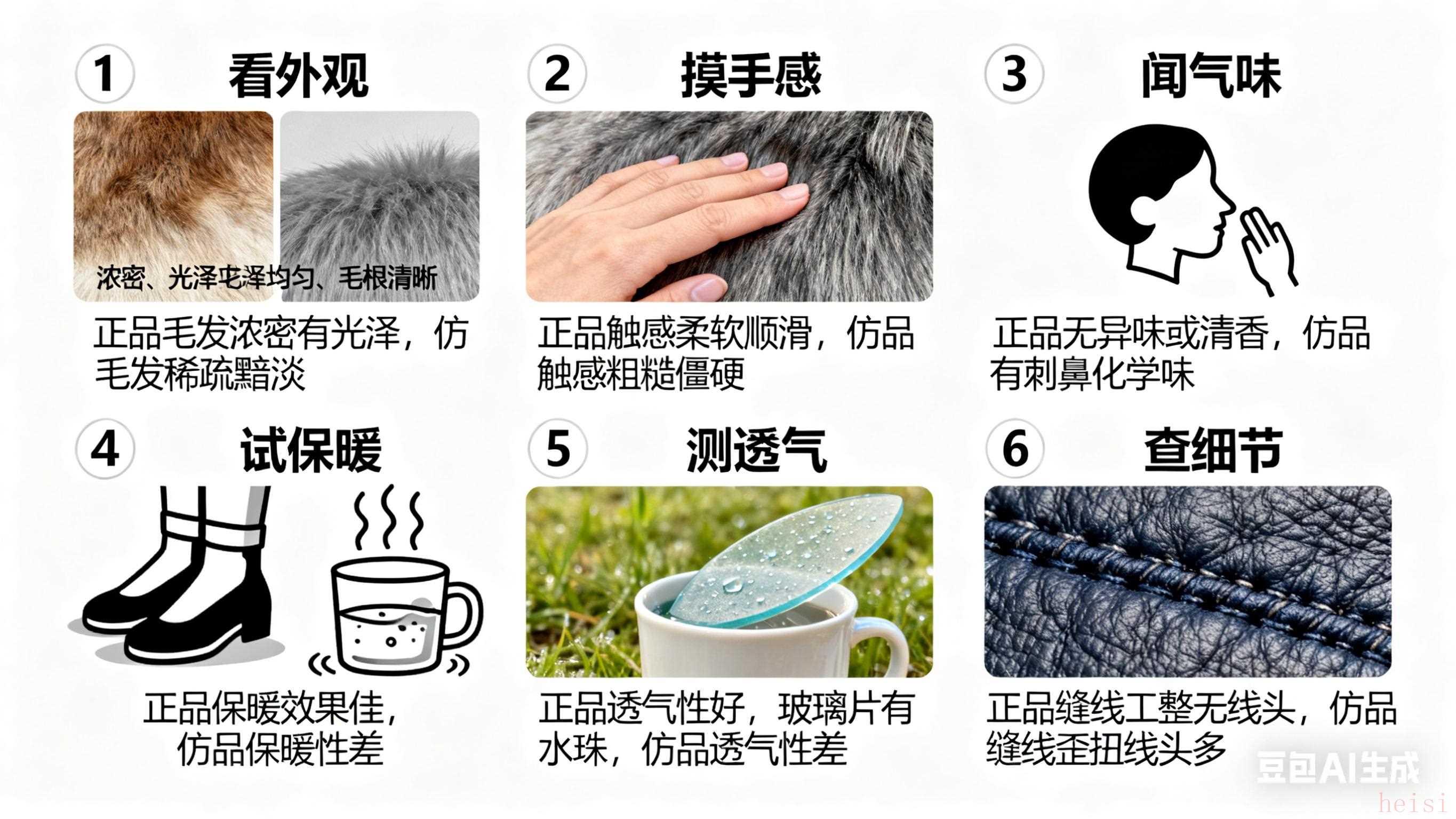 正品皮毛色澤自然,毛發(fā)濃密有層次感;仿品毛發(fā)稀疏呆板。