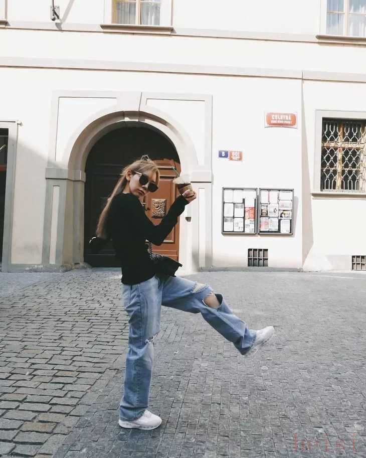 同款牛仔褲旅游的時(shí)候搭配了一件黑色針織,酷得很隨性。