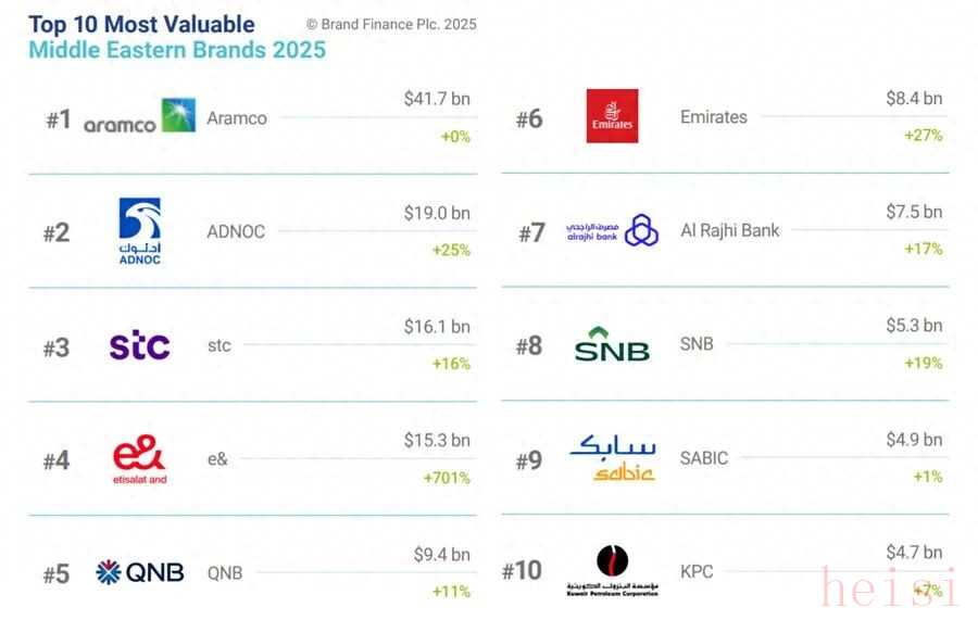 英國品牌評估機構“品牌金融”(Brand Finance)發(fā)布“中東地區(qū)品牌價值150強”排行榜(Middle East 150 2025)。沙特阿美、阿布扎比國家石油公司、沙特電信、e&、卡塔爾國家銀行、阿聯(lián)酋航空、拉吉哈銀行、沙特國家銀行、沙特基礎工業(yè)、科威特石油集團名列前十位。