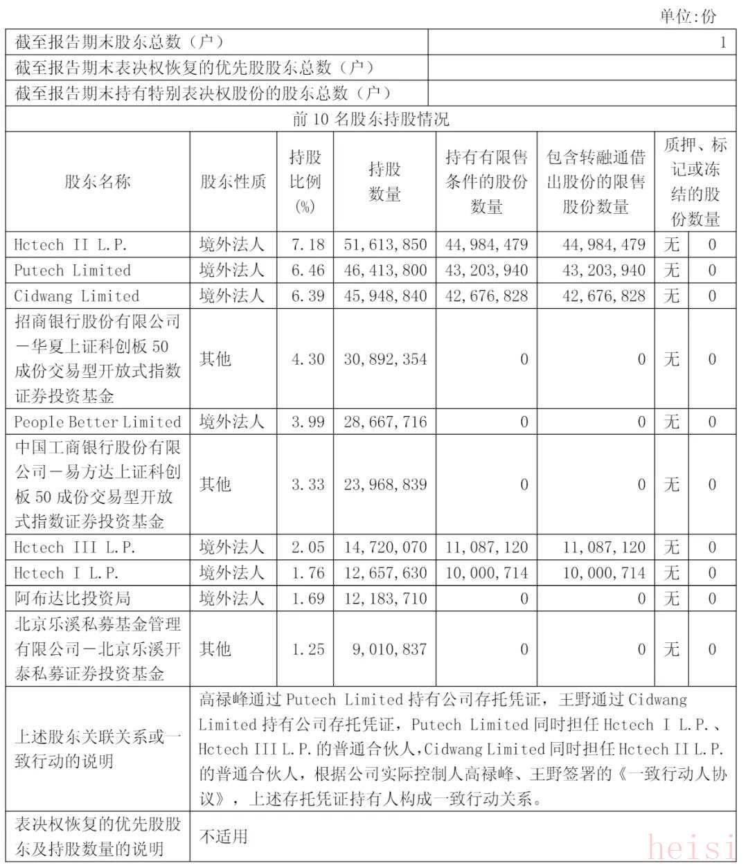 高祿峰通過 Putech Limited 持有公司存托憑證,王野通過Cidwang持有公司存托憑證,Putech Limited 同時擔(dān)任Hctech IL.P.、Hctech III的普通合伙人,Cidwang Limited同時擔(dān)任HctechIIL.P.的普通合伙人,根據(jù)公司實際控制人高祿峰、王野簽署的《一致行動人協(xié)議》,上述存托憑證持有人構(gòu)成一致行動關(guān)系。