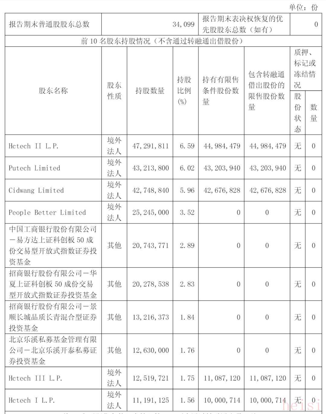 截至2025年6月30日,Hctech II L.P持股為7.18%,Putech Limited持股為6.46%,Cidwang Limited持股為6.39%;
