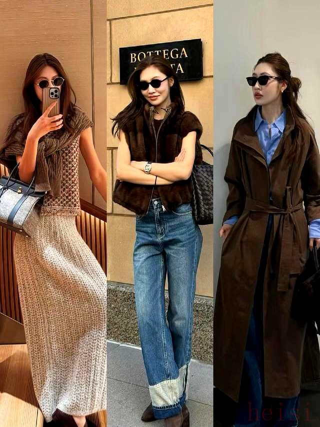 "色彩過渡自然:" 咖色(或卡其色、米色等暖棕色系)與深藍色搭配非常和諧,屬于中性色,能很好地中和牛仔的隨意感,提升整體造型的成熟度和質感。