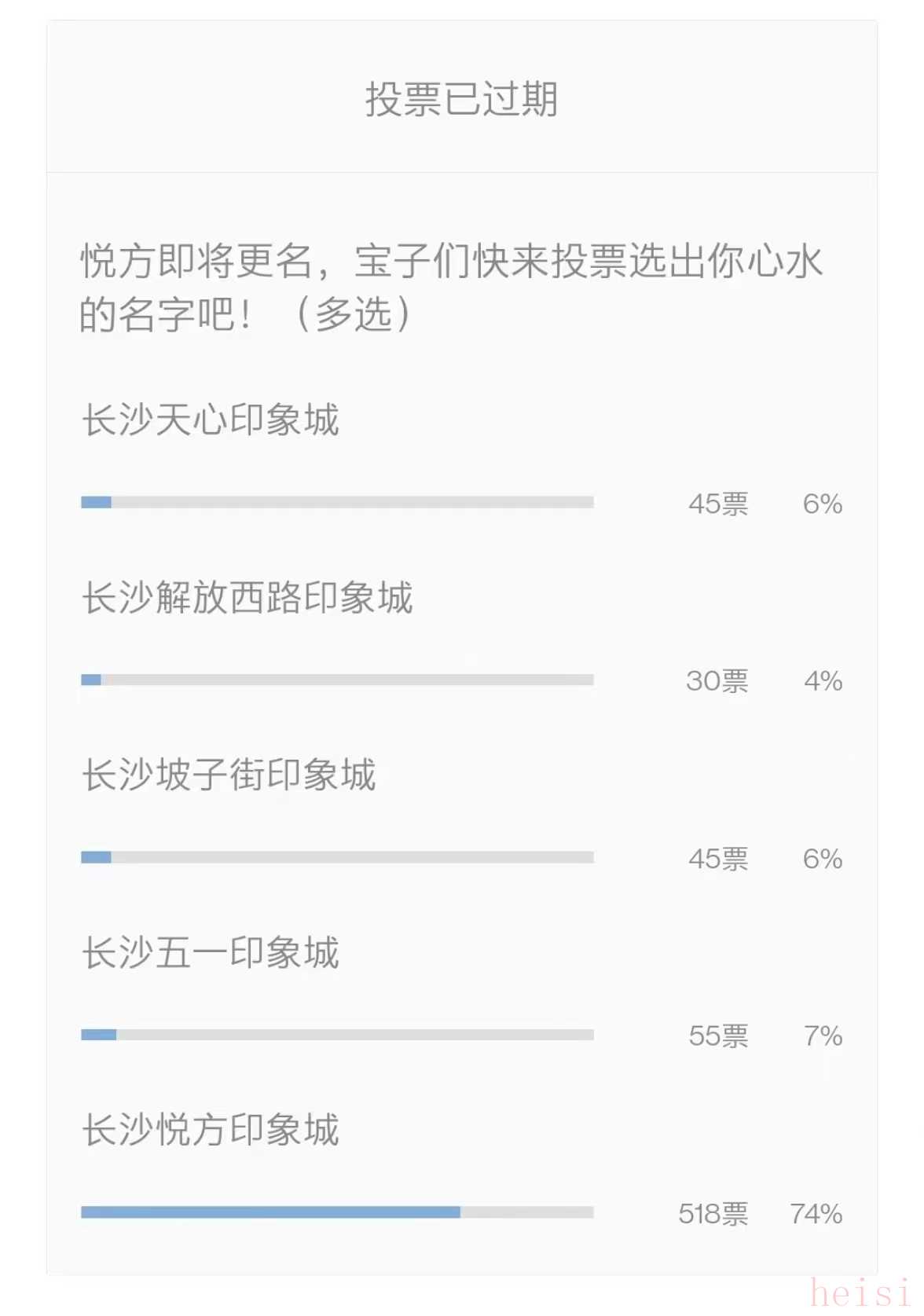 值得一提的是,今年4月,悅方ID Mall在官方微信公眾號(hào)發(fā)布了更名的投票。彼時(shí),投票的備選名稱(chēng)有長(zhǎng)沙天心印象城、長(zhǎng)沙解放西路印象城、長(zhǎng)沙坡子街印象城、長(zhǎng)沙五一印象城、長(zhǎng)沙悅方印象城,目前該投票已過(guò)期,“長(zhǎng)沙悅方印象城”一名呼聲最高,得票率占74%,獲得518票。如此看來(lái),原有的提名都被否定。