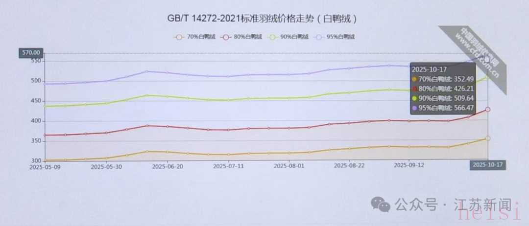 根據(jù)中國羽絨信息網(wǎng)數(shù)據(jù),90%絨子含量的白鴨絨原料約為每千克510元,折算下來每100克成本大約51元;而70%的白鴨絨每千克約352元,每100克成本約35元。