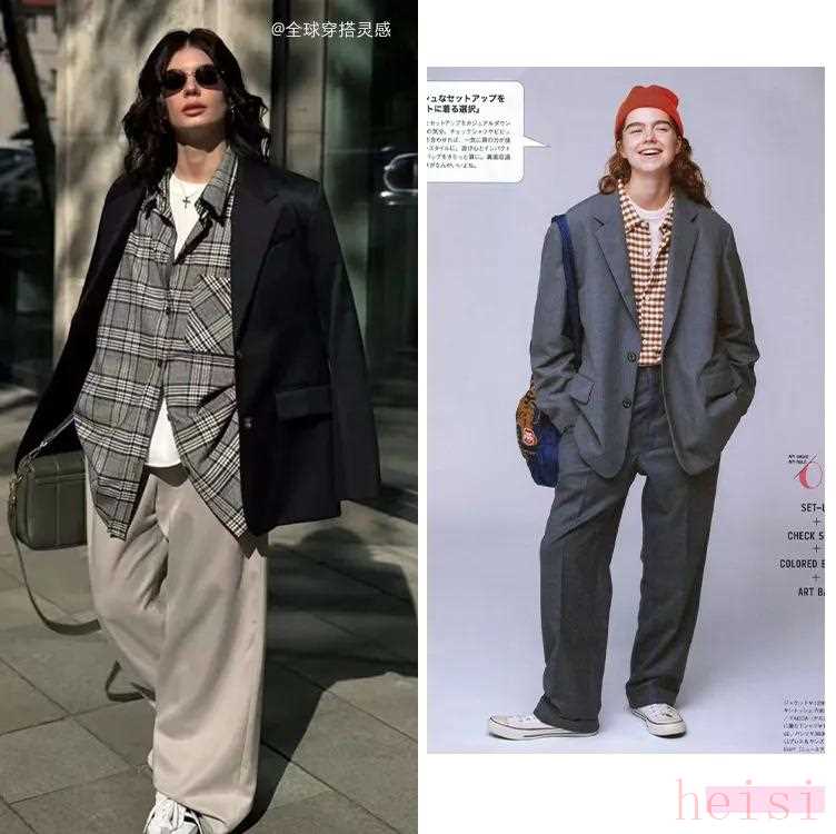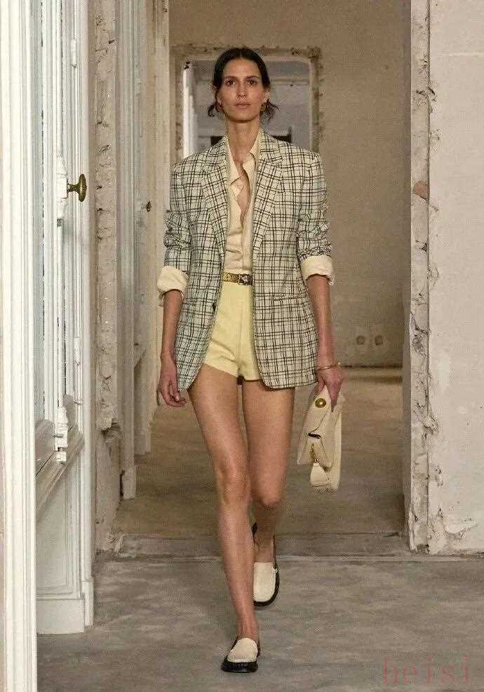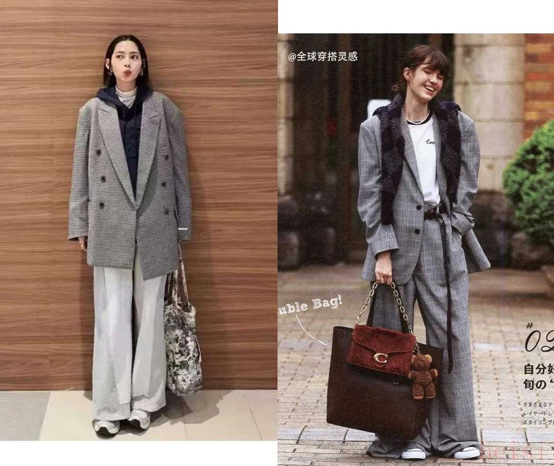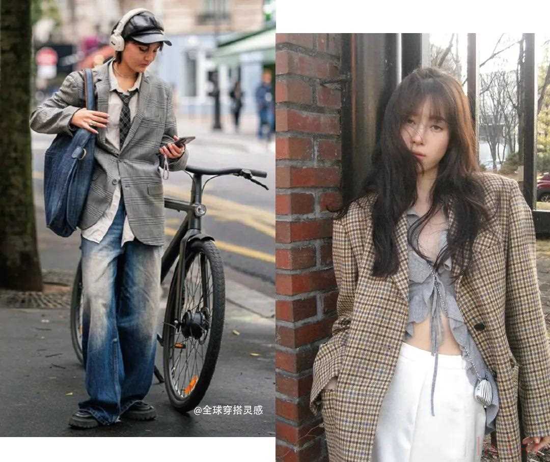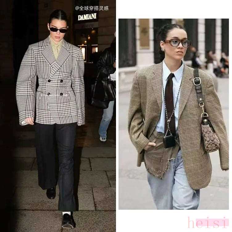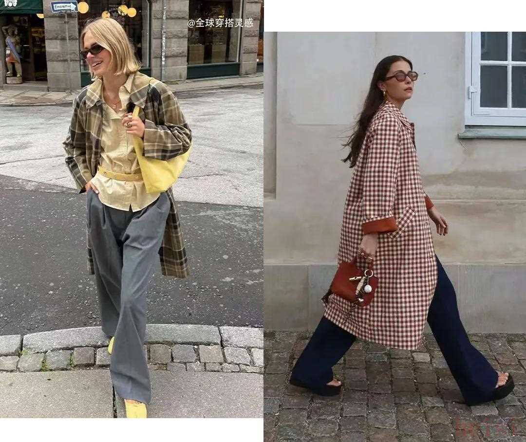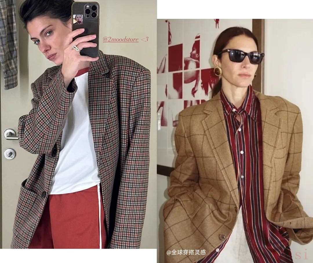 除了風(fēng)衣之外第二值得入手的就是格紋西裝啦西裝版型就選時(shí)興的彰顯女性力量的收腰或?qū)捈缈?/p>